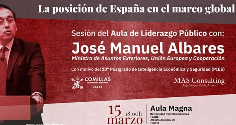 José Manuel Albares, ministro de Asuntos Exteriores, estará este 15 de marzo en el Aula de Liderazgo Público de MAS Consulting y la Universidad Pontificia Comillas ICADE. La sesión será a las 18:00 horas y el registro de participación se puede realizar en este enlace.