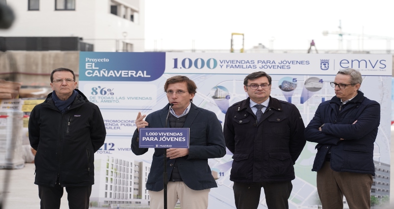 El Ayuntamiento de Madrid destinará al alquiler asequible para jóvenes 1.000 de las 1.212 viviendas que la Empresa Municipal de la Vivienda y Suelo (EMVS) tiene actualmente en distintas fases de ejecución en el barrio de El Cañaveral, distrito de Vicálvaro, uno de los barrios madrileños con más proyección de futuro y donde está prevista la construcción de 14.000 viviendas. Así lo ha señalado esta mañana el alcalde de Madrid, José Luis Martínez-Almeida, en su visita a las obras de una de estas promociones, en la que ha estado acompañado del concejal delegado de Vivienda y presidente de la EMVS, Álvaro González, y el concejal de Vicálvaro, Martín Casariego.