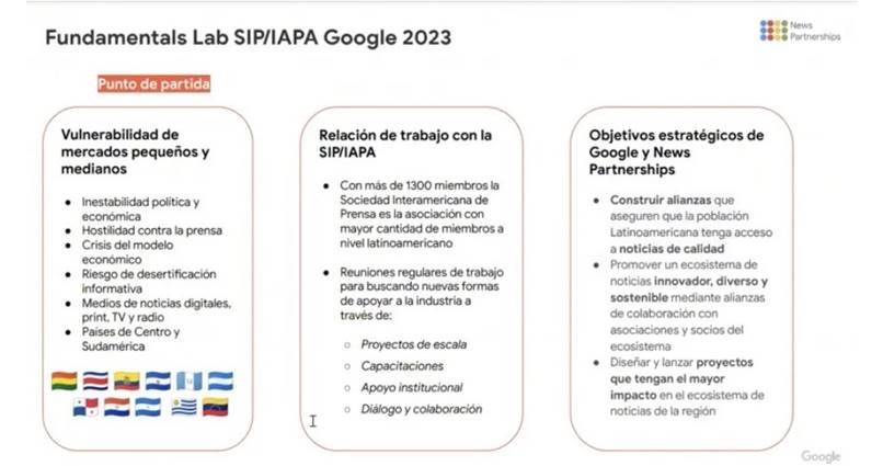 “El nuevo proyecto con Google nace como un reclamo de la organización para ayudar a los medios más vulnerables, en lo económico y político, en países donde la plataforma tiene poca presencia”, explicó el director ejecutivo de la SIP, Ricardo Trotti, durante la reciente reunión de medio año de la organización.