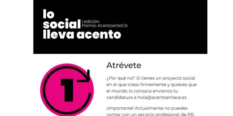 La agencia de comunicación y PR AcentoenlaCé lanza la I edición del Premio AcentoenlaCé “Lo social lleva Acento”. El equipo pone en marcha esta iniciativa para ofrecer un servicio profesional de comunicación enfocado en dar visibilidad en medios, con un servicio pro bono durante un año, a una asociación, fundación u ONG con un proyecto al servicio de la sociedad.