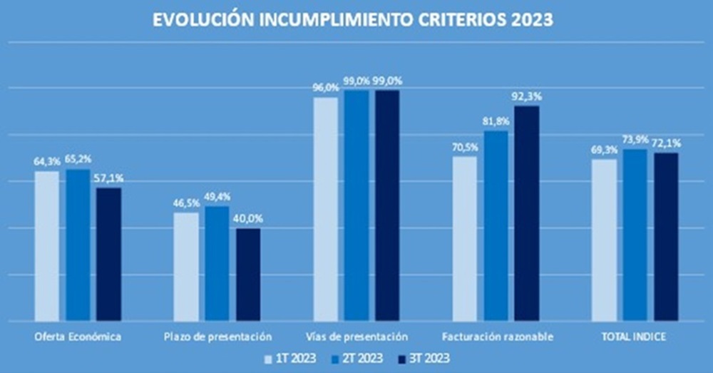 Ahora bien, en cuanto a la evolución del incumplimiento de los criterios establecidos en las convocatorias de concursos del año 2023 es positiva en dos de los criterios analizados, y negativa en otros dos. En términos generales, el índice de incumplimiento de los criterios del Observatorio de Concursos Públicos fue del 69,3% en el primer trimestre, del 73,9% en el segundo, y del 72,1% en el tercero. Mientras que lo más preocupante sigue siendo la exigencia de una elevada facturación para poder participar, que en el primer trimestre figuraba en el 70,5% de los concursos, en el segundo subió al 81,8%; y en el tercero aumentó hasta el 92,3%.