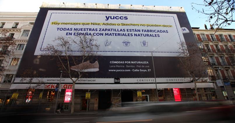 Esta campaña se materializa en una gran lona de 700 m2 en la emblemática Calle Serrano, concretamente en el número 29, con un mensaje creativo donde Yuccs destaca la producción local y el uso de materiales naturales en sus productos.