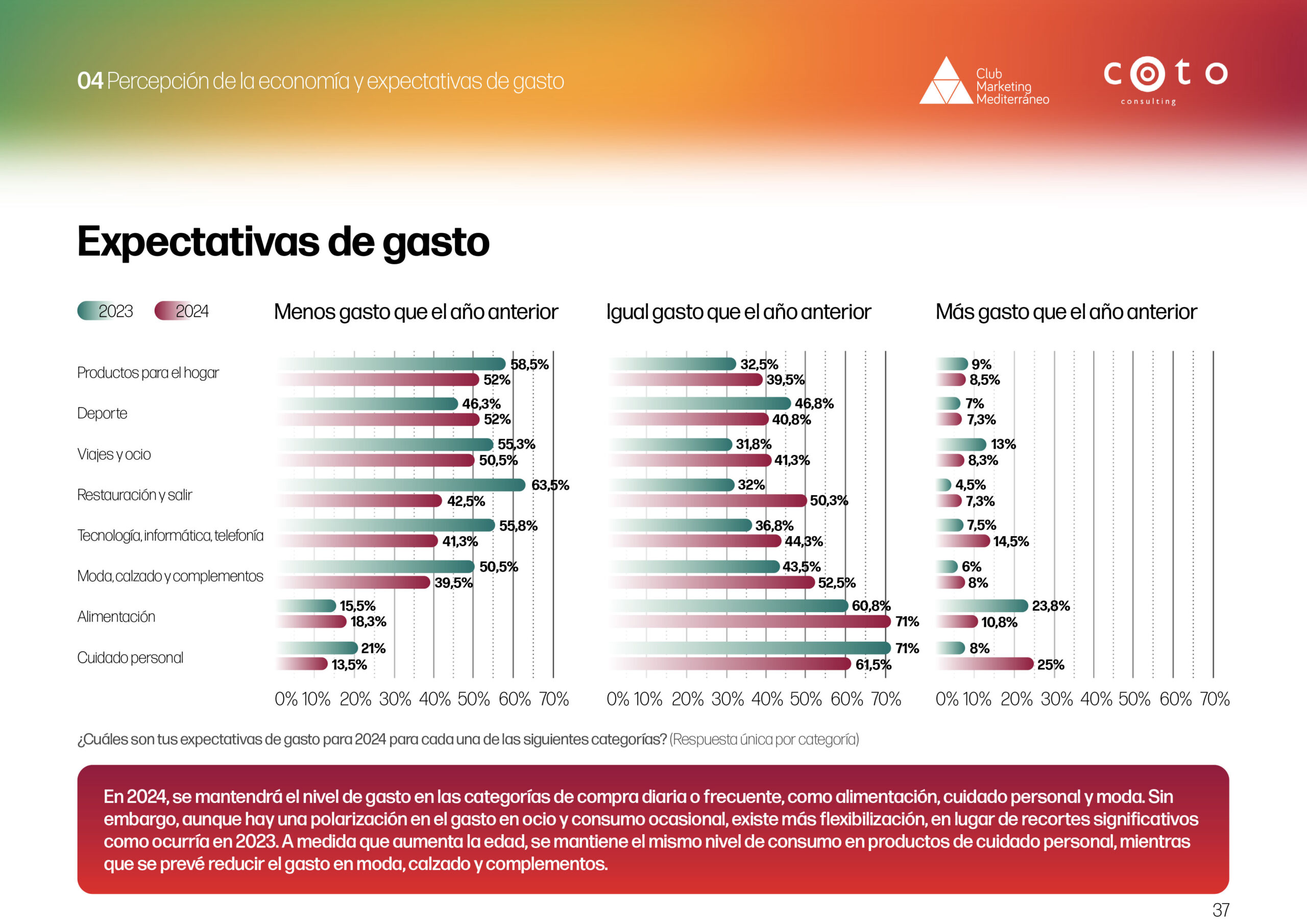 Por otro lado, según los datos, en 2024 se mantendrá el nivel de gasto en las categorías de compra diaria o frecuente, como alimentación (71 %), cuidado personal (61,5 %) y moda (52,5 %). Sin embargo, hay una polarización en el gasto en ocio y consumo ocasional ya que, parte de los consumidores planean gastar menos, y otros la misma cantidad que en 2023, por lo que existe una flexibilización, en lugar de recortes significativos como en el año anterior.