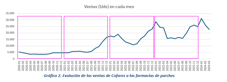 Por otro lado, en relación con los productos OTC antitabaco, el Observatorio ha identificado también un significativo aumento en la demanda de parches de nicotina, que ha experimentado un crecimiento acumulado del 400% desde la pandemia. Pasando de las 4.213 unidades por mes en 2020 a las 21.034 mensuales en 2023.