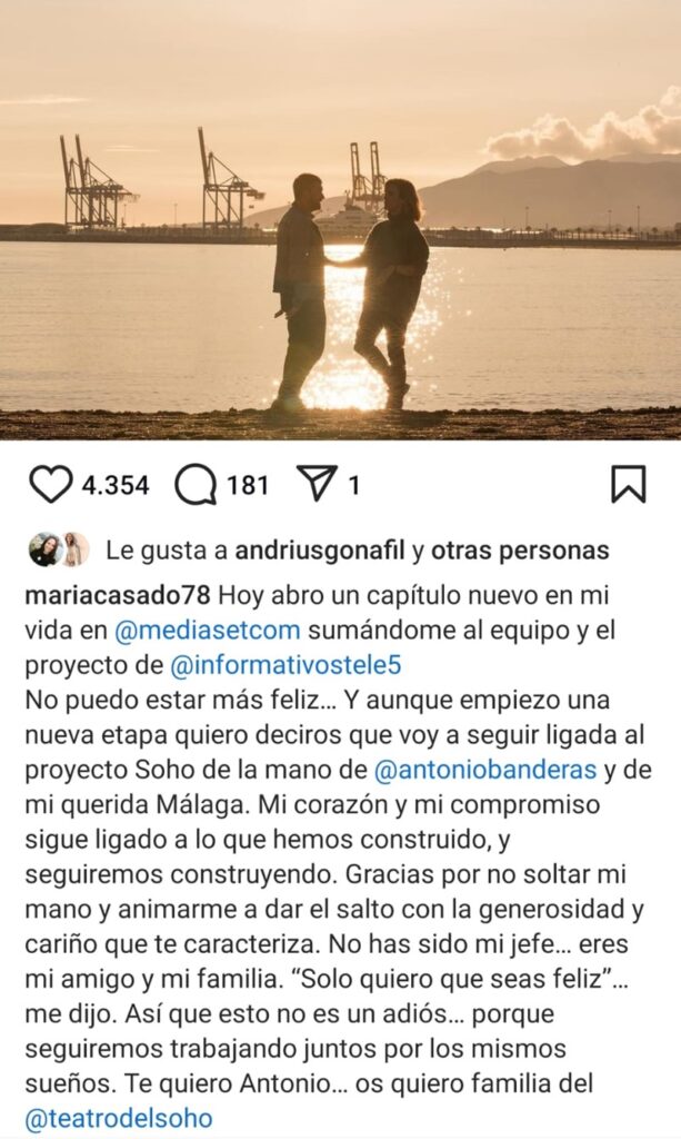 Sus proyectos han estado ligados a la productora Soho que ha compartido y seguirá compartiendo, tal y como ella misma ha confirmado, junto a Antonio Banderas. “No puedo estar más feliz…Y aunque empiezo una nueva etapa, quiero deciros que voy a seguir ligada al proyecto Soho de la mano Antonio Banderas”. El resto de la información se conocerá el próximo jueves, en la presentación de todo el equipo de informativos Telecinco.