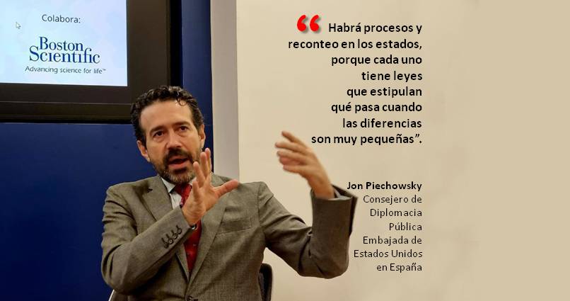 Jon Piechowski, Consejero de Diplomacia Pública de la Embajada de Estados Unidos en España, desde la perspectiva diplomática, ha explicado la complejidad de este sistema electoral y ha dejado claro que el objetivo de cada candidato es alcanzar los 270 votos electorales que necesita para lograr la mayoría absoluta. “A través de todos los medios hay que ir a los campos de batalla de los siete estados claves en este momento, Arizona, Nevada, Wisconsin, Michigan, Pensilvania, Carolina del Norte y Georgia”, apuntó.