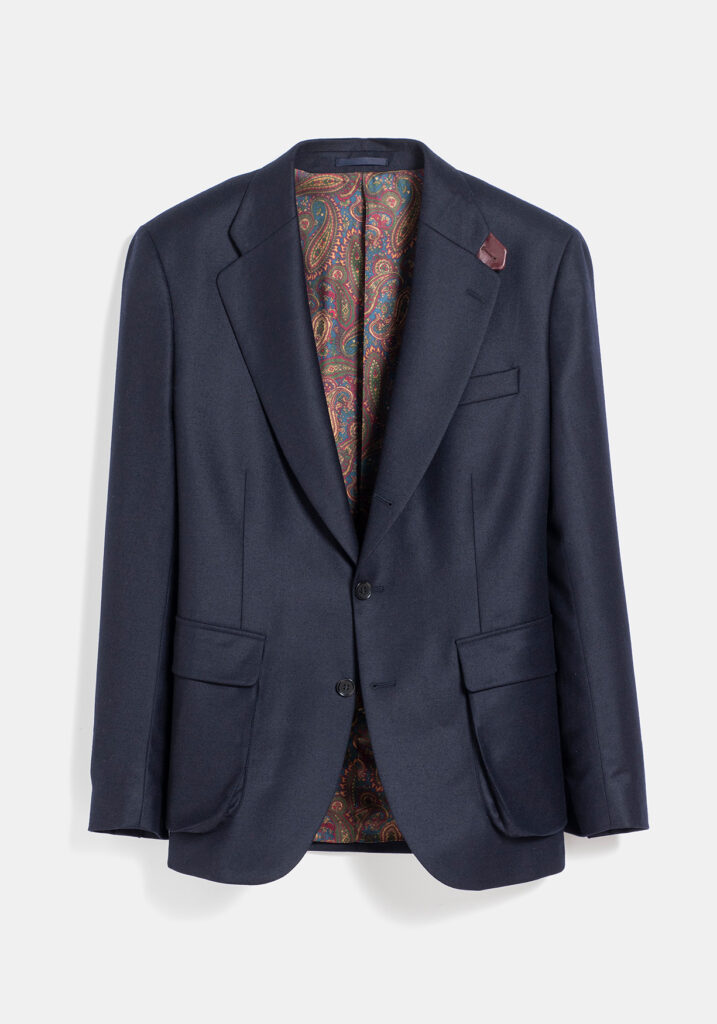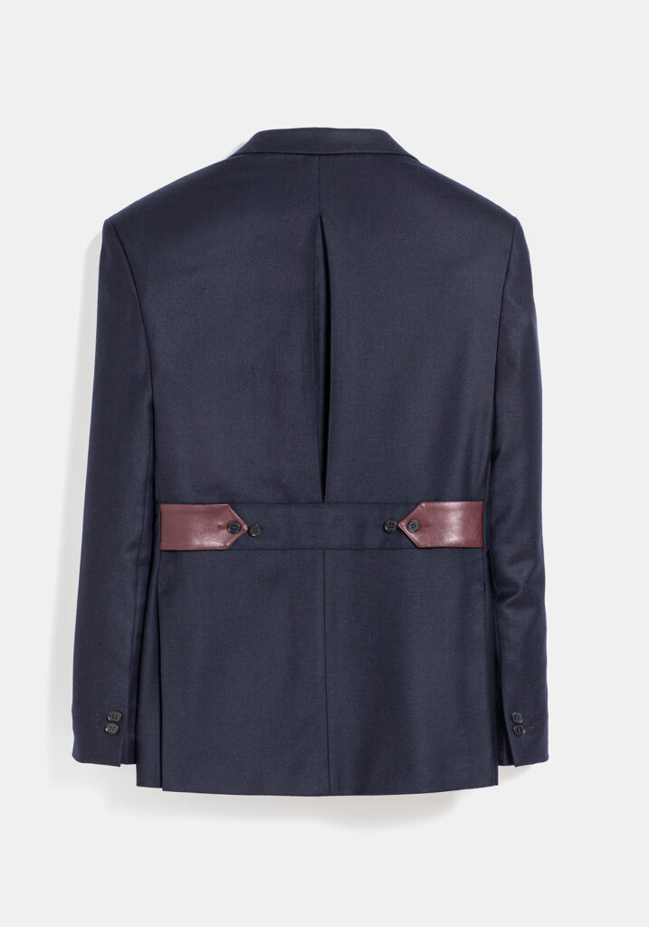 Confeccionada en tejido Loro Piana, conocido por su excepcional suavidad y durabilidad, la americana se presenta en un tono azul medianoche. El color atemporal se combina con detalles en piel italiana, que ha sido cuidadosamente seleccionada por la firma especializada Glent para garantizar su sostenibilidad y durabilidad.