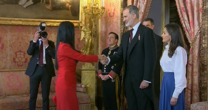Don Felipe y Doña Letizia recibían, como cada año, al Cuerpo Diplomático acreditado en España, compuesto en total por 126 Embajadas y casi 800 Consulado. Se encontraban también el presidente del Gobierno, Pedro Sánchez, y el ministro de Asuntos Exteriores, Unión Europea y Cooperación, José Manuel Albares. El Rey saludó a Gutiérrez y a su esposo, tras hacer lo propio con el embajador de Pakistán.