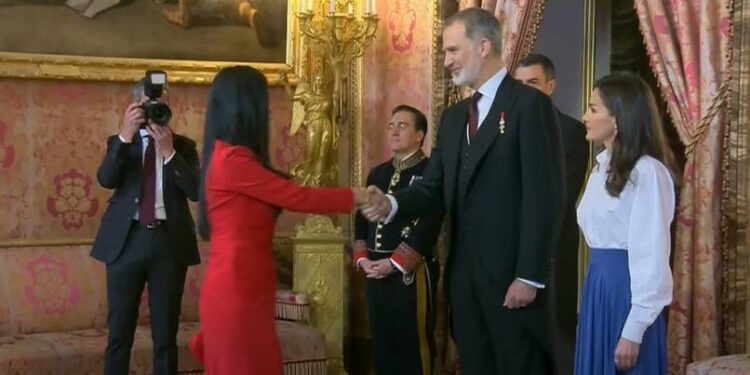 Don Felipe y Doña Letizia recibían, como cada año, al Cuerpo Diplomático acreditado en España, compuesto en total por 126 Embajadas y casi 800 Consulado. Se encontraban también el presidente del Gobierno, Pedro Sánchez, y el ministro de Asuntos Exteriores, Unión Europea y Cooperación, José Manuel Albares. El Rey saludó a Gutiérrez y a su esposo, tras hacer lo propio con el embajador de Pakistán.