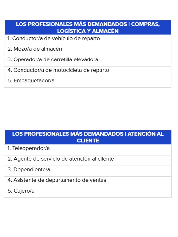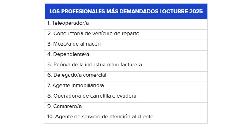 En el mes de octubre, las tres primeras posiciones del ranking de los puestos más demandados las ocupan teleoperador/a, con casi 18.000 puestos de trabajo ofertados; conductor/a de vehículo de reparto, con 17.350; y mozo/a de almacén, con 17.000. Y entre las que más crecen respecto a septiembre destacan algunos de los vinculados a las campañas de consumo: conductor/a de vehículo de reparto (+57%), mozo/a de almacén (+23%) y dependiente/a (+9,5%). El primero también aumenta un 53% respecto a hace un año.