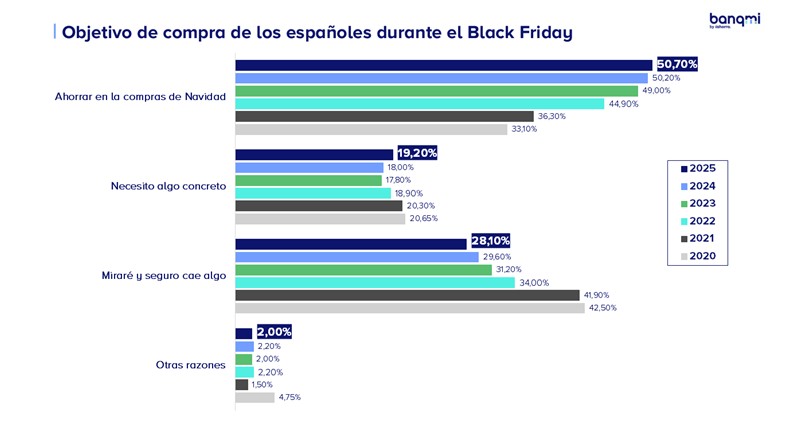 El adelanto de las compras navideñas se confirma un año más como la motivación principal para comprar en el Black Friday. La encuesta del comparador financiero Banqmi muestra que el 50,70% de los consumidores utiliza este día para reducir el gasto que les espera en diciembre. La variedad de productos, la extensión del periodo promocional y la percepción de que las ofertas permiten amortiguar la subida de precios hacen que cada vez más hogares planifiquen regalos, compras familiares y tecnología para estas fechas.