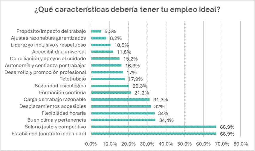 Detrás de la elección de estas características más demandadas subyace un anhelo profundo para las personas con discapacidad: el empleo sostenible y la estabilidad profesional, siendo esta la base esencial para su bienestar y autonomía.