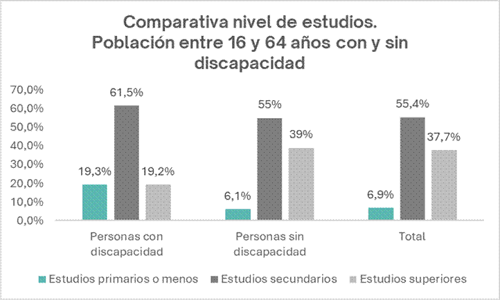 Las estadísticas también evidencian una menor participación y nivel educativo de las personas con discapacidad en comparación con la población general. Según el Observatorio Estatal de la Discapacidad, el porcentaje de población con discapacidad con estudios primarios o menos (19,3%) es significativamente mayor que la de la población general (6,1%), y solo el 19,2% de las personas con discapacidad logra completar estudios superiores, frente al 39% de la población sin discapacidad. Se estima que más del 60% de las personas con discapacidad cesan sus estudios al finalizar la educación secundaria obligatoria, lo que indica que la mayoría no accede a etapas postobligatorias (bachillerato, formación profesional o universidad).