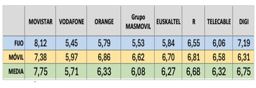 En el extremo contrario, Vodafone con 2,96. Los operadores bajo la órbita de la fusión Másmovil y Orange (estos y Euskaltel, R y Telecable) se sitúan en 1,38. Por último, Movistar registra 1,15. En atención al cliente las quejas de los usuarios sitúan a R como el mejor operador con un volumen de 0,021 por 10.000 abonados. Por debajo del 0,1 se encuentran Digi, Euskaltel, Orange y Movistar. Vodafone presenta un volumen de 0,13 y Másmóvil un 0,15 por cada 10.000 abonados.