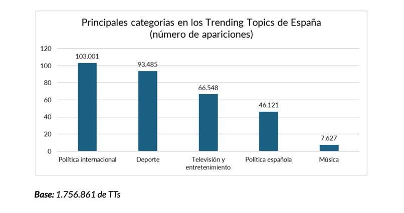 La política (internacional y nacional), y el deporte, concentraron el mayor volumen de menciones y atención a lo largo del año 2025, consolidándose como los motores centrales de la conversación pública en la red social en España. Así lo revela un estudio de Buzzmonitor, plataforma de inteligencia artificial para la gestión de redes sociales y atención multicanal, en un estudio sobre los Trending Topics en X (antes Twitter) clasificándolos en categorías temáticas.