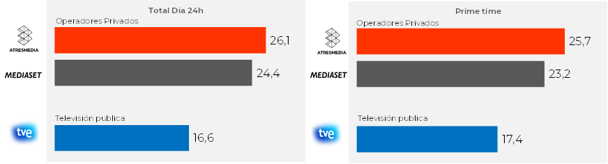 Atresmedia es el grupo de TV más visto en 2025 y lo hace por cuarto año consecutivo. Aventaja a Mediaset en 1,7 puntos, la mayor distancia histórica entre grupos a pesar de tener Atresmedia una cadena menos. También lidera en prime time con un 25,7% de cuota: 2,5 puntos por delante de Mediaset (23,2%). Además, continúa como el grupo de TV por el que más gente pasa cada día con más de 16 millones de espectadores únicos diarios.