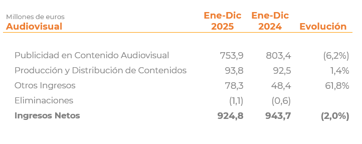 Sobresale el comportamiento especialmente positivo de las áreas del Grupo no directamente vinculadas al mercado publicitario, como la Producción y Distribución de contenidos, así como el crecimiento de Otros Ingresos gracias a la incorporación de nuevas compañías. Estos elementos han ayudado a compensar la debilidad del mercado publicitario en Contenido Audiovisual, marcada por una comparación particularmente exigente con el ejercicio anterior.