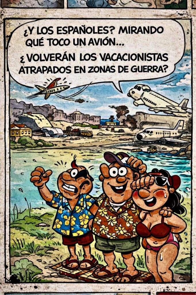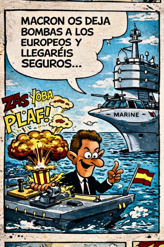 Y el presidente discutido de Francia que dicen los de la extrema derecha que no lo es… sí lo es, es un Elfo… Pues va el colega, se pilla un helicóptero, de los que dan susto y se marcha a ver a los del Charles de Gaulle, portaaviones francés, parecido a los españoles, pero de acero, no de palillos de los betik del cole de los niños. Y le dice a los europeos: os dejamos bombas atómicas, os ayudamos con el escudo, os protegemos… Y los españoles mirando al cielo de Torrejón o Getafe o Jolibú, para ver si regresan el resto de los que allí, en la zona de guerra, siguen esperando. ¿Su delito? Viajar de vacaciones, vivir y trabajar allí… ¡Vaya usté a saber! Pero que vuelvan. Porque tendremos que votar a Macron y pedirle que enseñen a los españoles a gastarse el dinero en lo que hace falta y no en gambas, carísimos coches, subvenciones vergonzosas…
