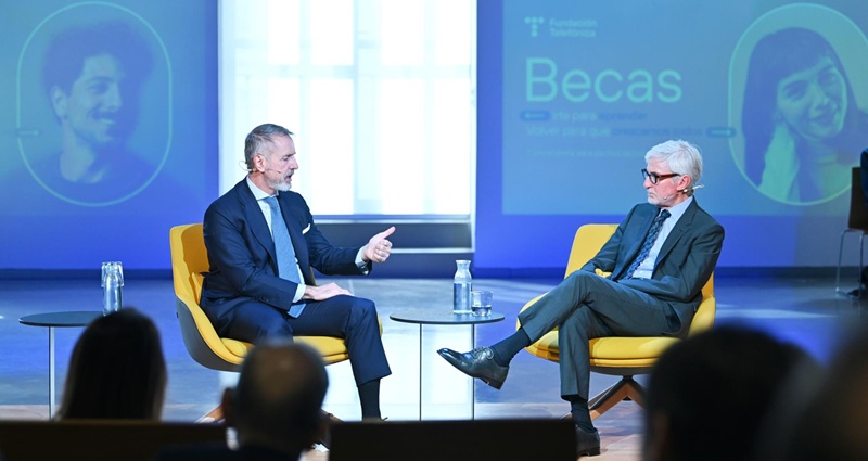 El presidente ejecutivo de Telefónica, Marc Murtra, y el presidente de Fundación Telefónica, Enrique Goñi han presentado en Espacio Fundación Telefónica un programa pionero de 50 becas anuales, dotadas con un máximo de hasta 80.000 euros cada una, dirigidas a estudiantes de máster y doctorado para especializarse en áreas tecnológicas clave como Inteligencia Artificial, Machine Learning, ciencia de datos y ciberseguridad, física aplicada y tecnologías cuánticas, entre otras.