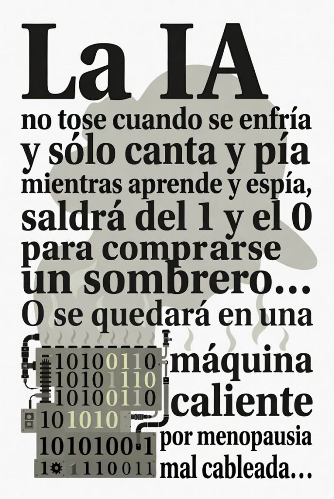 La Ilustración la ha realizado la IA con la siguiente frase: La IA no tose cuando se enfría y sólo canta y pía mientras aprende y espía, saldrá del 1 y el 0 para comprarse un sombrero… O se quedará en una máquina caliente por menopausia mal cableada…