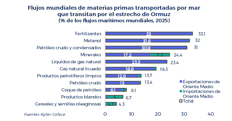 “La actual escalada en Oriente Medio está afectando duramente a los mercados de materias primas. El hecho de que el conflicto llegue o no a un punto muerto determinará el alcance del impacto actual en la parte descendente de la cadena de valor”, afirma Simon Lacoume, economista sectorial de Coface.