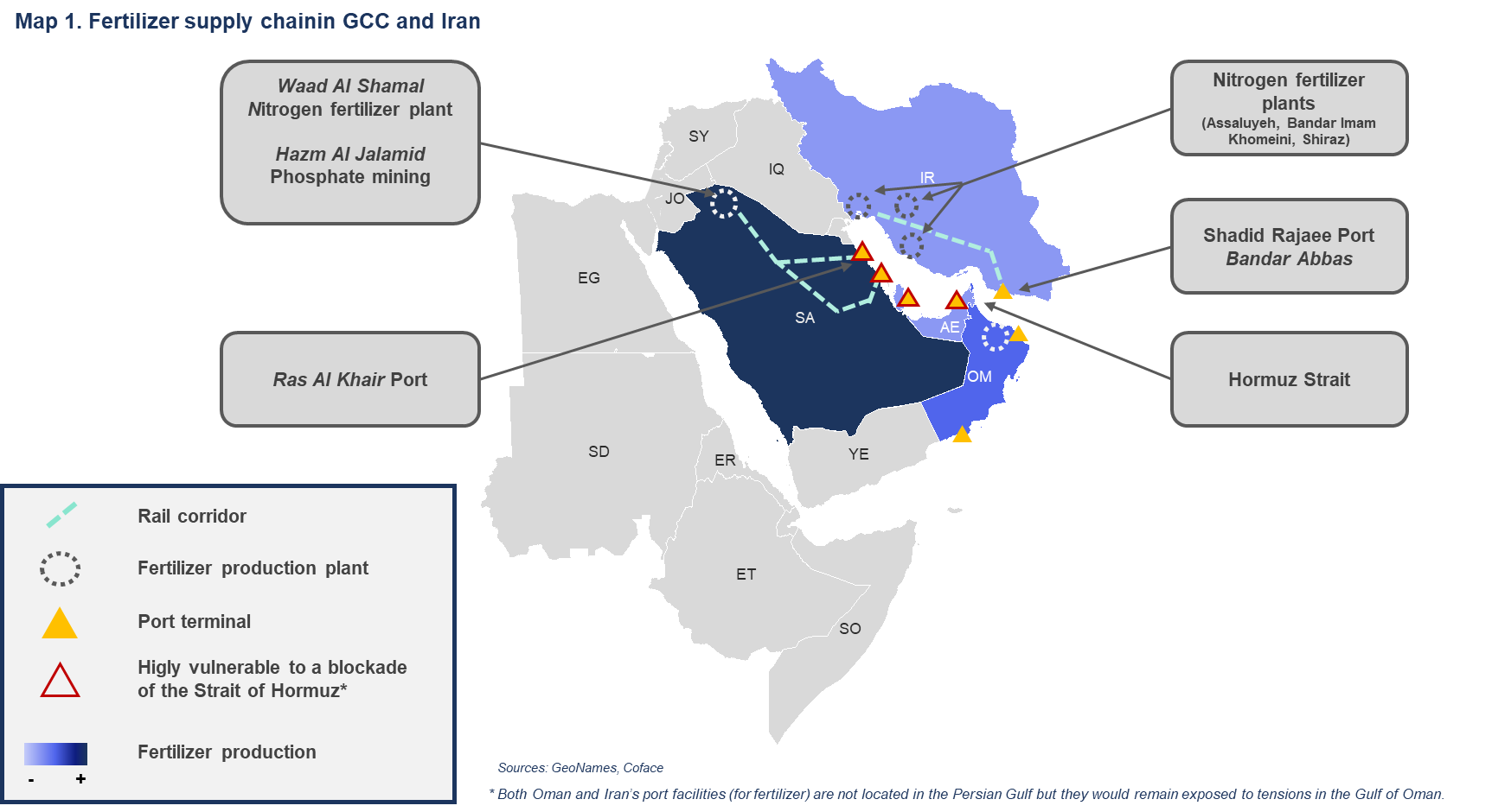 Gracias al abaratamiento de los suministros energéticos nacionales, los países del Golfo ocupan una posición central en estos mercados, representando casi el 19 % de las exportaciones mundiales de fertilizantes nitrogenados y el 36 % del volumen mundial de urea, mientras que Arabia Saudí es el cuarto mayor exportador de fosfatos (Mapa 1).