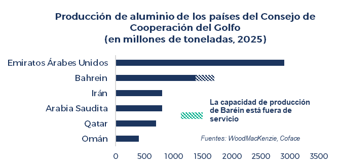 Con el estrecho de Ormuz bloqueado, los países del Golfo —que representan el 8 % de la producción mundial de aluminio— no pueden exportar su producción nacional ni importar las materias primas (bauxita y alúmina) que necesitan sus fundiciones. El lunes 16 de marzo, Aluminum Bahrain (Alba) —que produce el 25 % del aluminio de la región— anunció, en consecuencia, la suspensión del 19 % de su producción, lo que representa el 5 % de la producción de aluminio este metal de la región.