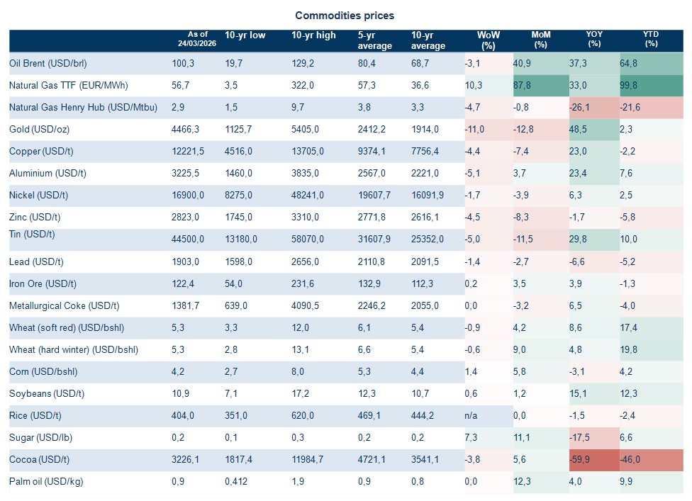 En comparación, el mercado estadounidense parece menos expuesto a las interrupciones del suministro. No obstante, el Henry Hub estadounidense se encuentra bajo una fuerte presión alcista (+36 % intermensual), una señal de que las tensiones energéticas ya se han extendido a nivel mundial.
