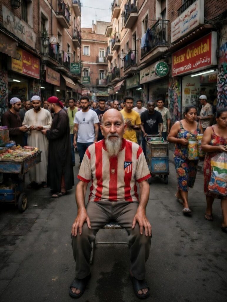 Vive en un tercero sin ascensor donde las plantas se suicidan lentamente y las facturas de la luz forman una torre de Babel de papel incomprensible. Tiene setenta y tres años aparentes, una calva que refleja las farolas y estrellas, como un espejo antiguo y una barba blanca que parece haber crecido de la misma luna que ya no adora, mal recortada y se esconde luciendo una camiseta del Atlético de Madrid  que le queda grande, como a Cerezo.